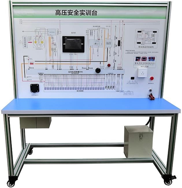3.面板上安裝有點(diǎn)火開關(guān)、電動(dòng)汽車真實(shí)鋰電池組,電動(dòng)汽車安全維修塞插頭模塊,高壓電路仿真系統(tǒng),安全繼電器組件,漏電保護(hù)模塊與模擬操縱開關(guān)。