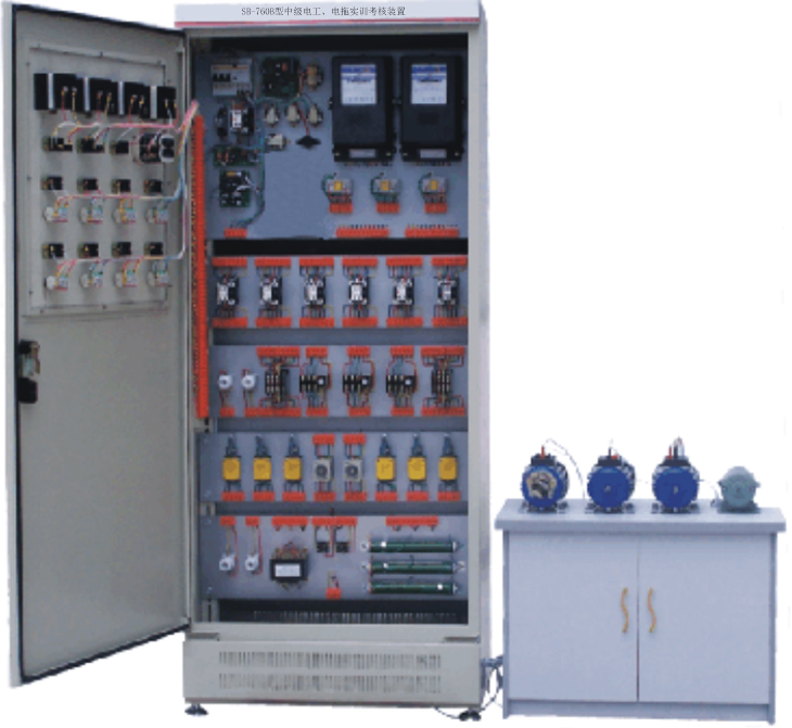中級電工、電拖實訓考核裝置是按照勞動社會保障部頒發(fā)的“工人技術(shù)等級標準”和“職業(yè)技能鑒定規(guī)范”的內(nèi)容要求,根據(jù)初級電工培訓考核的實際情況而設計的新一代集培訓學習、理論驗證、實際操作能力、考核鑒定于一體的多功能柜式設備。整臺設備以標準的電氣控制柜為主柜,利用柜體的雙面空間,布置電器 及配套實驗器材,能完成初級電工考核鑒定中的電力拖動控制與照明電路的實操項目,該電工、電拖實訓考核裝置堅持理論聯(lián)系實際的原則,突出技能訓練,注重針對性、實用性、科學性,經(jīng)全國多家職業(yè)技能訓練中心、職校、技校使用證明,該柜體設計合理、實操方便,占地面積少。為延長電器的使用壽命,各電器的接點都與接線端子相連,再讓學生在接線端子上接線,連接電機、電器來完成各項控制實驗,有效降低材料消耗,延長使用壽命。該套設備適用于各勞動職業(yè)技能鑒定部門,同時適應各大、中專、技校、職校初級電工、電拖專業(yè)教學與實訓考核。