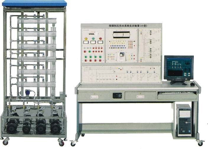 變頻恒壓供水系統(tǒng)實訓裝置,集PLC、變頻調速、過程控制、工程組態(tài)技術于一體。它由六層住宅消防、生活供水系統(tǒng)(實物模型),控制平臺兩大部分組成,包含了可編程控制器、變頻器、變頻磁力驅動泵、休眠泵、消防泵、壓力變送器、壓力儀表、輸水管道、消防栓、家用水龍頭、蓄水池等工程設備�?刂破脚_采用PLC+變頻器的開放式控制結構,可以完成多種模式下的樓層恒壓供水實訓實訓,為教學研究變頻恒壓供水技術提供一個開放的操作平臺。它是一款適合于大學及中、高職院校電氣自動化、樓宇自動化、建筑電氣、智能建筑等專業(yè)的綜合型技能實訓考核設備。