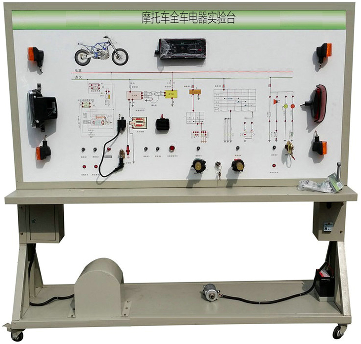 摩托車電器電路實訓(xùn)裝置采用全新本田125原車全車電器,包括所有燈光、喇叭、儀表、起動系統(tǒng)、發(fā)電系統(tǒng)以及相應(yīng)的設(shè)備等,設(shè)備整體采用近似原車的臺式布局,部件均安裝在4mm鋁塑面板上,面板采用UV平板彩色噴繪;各器件之間采用原車線束進行連接,構(gòu)建原車真實的實訓(xùn)情景,便于學(xué)生理解和掌握。本裝置可設(shè)置典型的原車電路故障,完成對學(xué)生的技能考核,也可用于職業(yè)技能培訓(xùn)和鑒定。