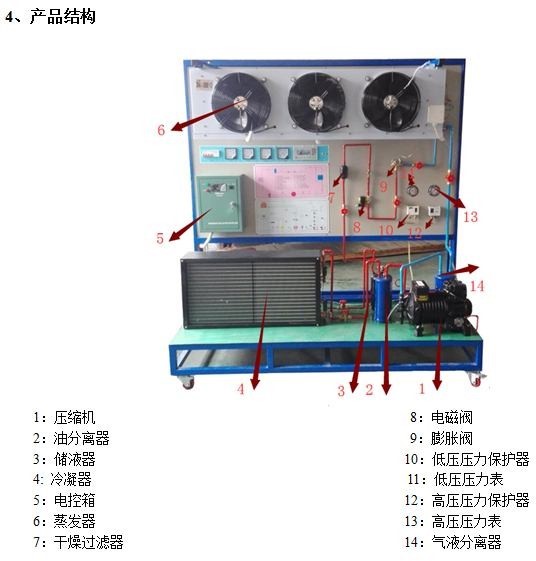 工業(yè)制冷系統(tǒng)實(shí)訓(xùn)考核裝置主要由半封閉式制冷壓縮機(jī)、冷凝器、蒸發(fā)器、膨脹閥和故障設(shè)置開關(guān)、測試儀表等組成。實(shí)訓(xùn)臺(tái)通過手閥開關(guān)和鈕子開關(guān)分別來設(shè)置管路系統(tǒng)和電控系統(tǒng)的 20 多種故障。設(shè)備采用先進(jìn)的電控系統(tǒng)并具有具有開相,缺相, 過流等保護(hù)功能。蒸發(fā)器風(fēng)扇采用變頻器控制速度。配備 8 路溫度計(jì),電壓表,電流表,功率表,功率因數(shù)表和壓力表,能實(shí)時(shí)觀察運(yùn)行參數(shù)