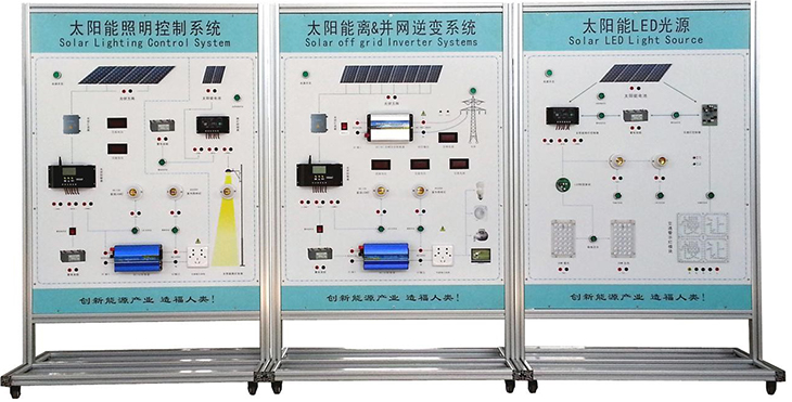 光伏發(fā)電系統(tǒng)集成演示版,主要由A、B、C三塊主模板組成。A 太陽能照明控制系統(tǒng)演示模板、B 太陽能離&并網逆變系統(tǒng)演示模板、C 太陽能LED光源系統(tǒng)演示模板。
