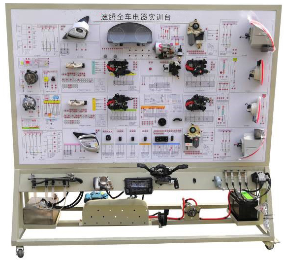 該設(shè)備采用 全新 大眾速騰1.6L 整車(chē)電器實(shí)物為基礎(chǔ),充分展示汽車(chē)發(fā)動(dòng)機(jī)防盜系統(tǒng)、儀表系統(tǒng)、燈光系統(tǒng)、雨刮系統(tǒng)、喇叭系統(tǒng)、點(diǎn)火系統(tǒng)、電動(dòng)車(chē)窗系統(tǒng)、電動(dòng)門(mén)鎖、音響系統(tǒng)、起動(dòng)系統(tǒng)和充電系統(tǒng)等汽車(chē)電器各系統(tǒng)的組成結(jié)構(gòu)和工作過(guò)程。