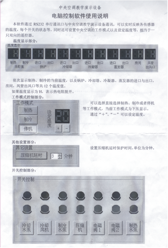 為了更好地滿足各大院校的教學需要,在原來開發(fā)的中央空調實驗設備的基礎上,配備了RS-232串行通訊接口,可直接與電腦連接,由電腦控制軟件控制整個實驗臺的運行,包括:總控臺啟動、制冷、制熱、冷卻水泵、冷卻風機、制冷水泵、壓縮機、電磁閥、制熱水泵做演示,制冷、制熱的溫度設定等。